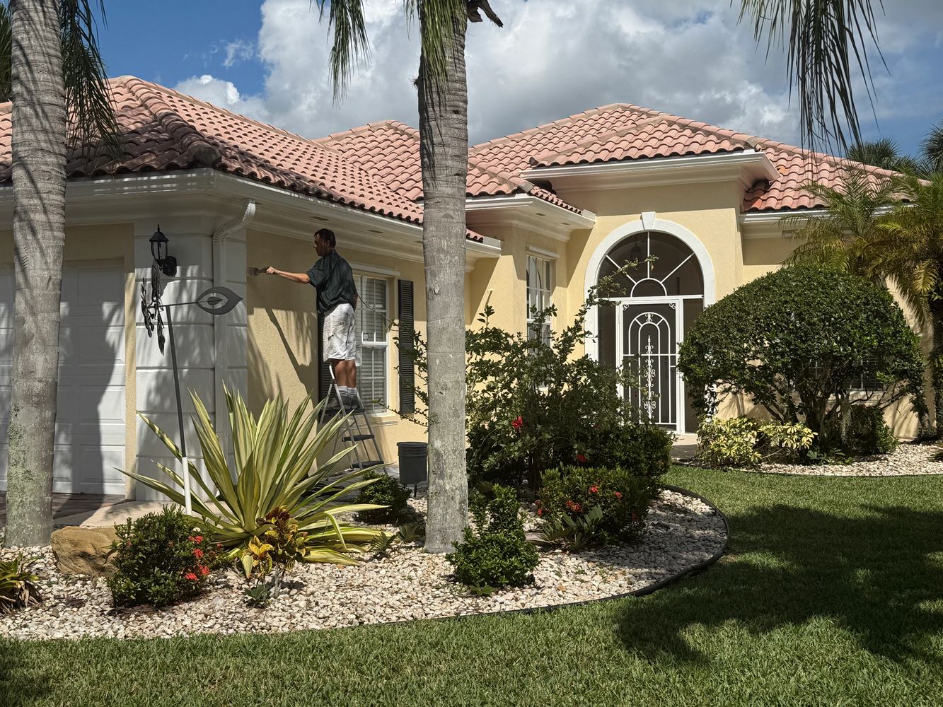 Our exterior painting process includes thorough pressure washing, crack filling, and surface repair. We specialize in stucco homes using professional Loxon primers and conditioners for proper adhesion, applied with airless sprayers and followed by back-rolling techniques for maximum paint penetration. We finish with premium Sherwin Williams and Benjamin Moore paints for superior weather protection against Florida's challenging climate.